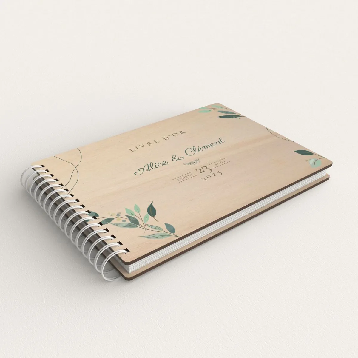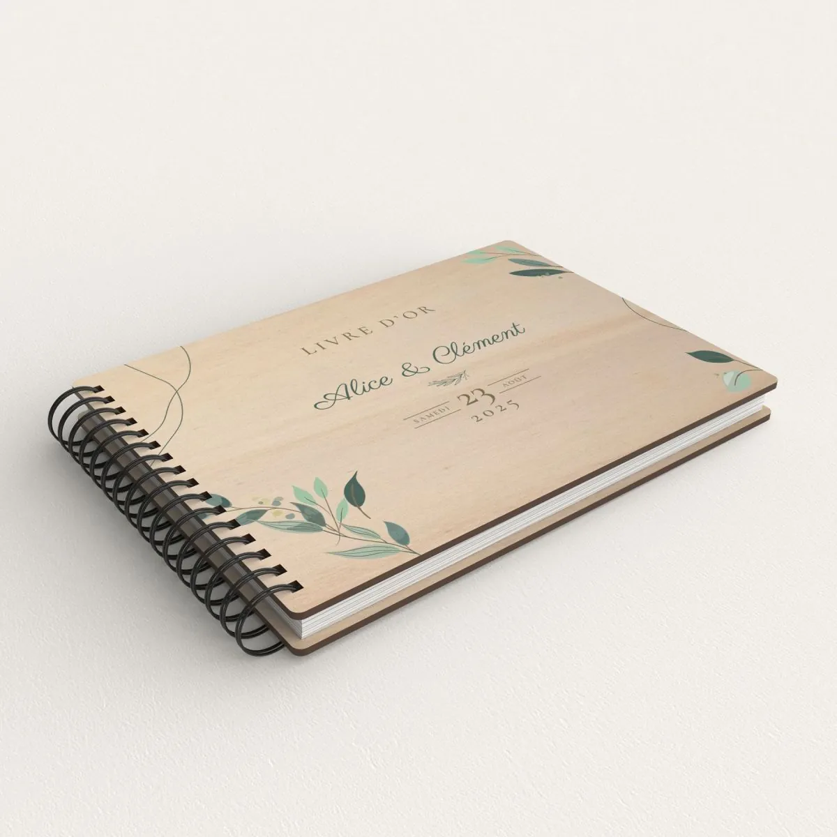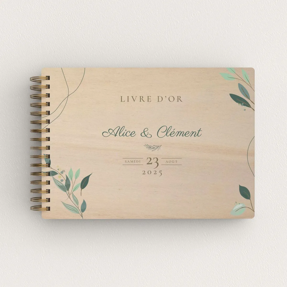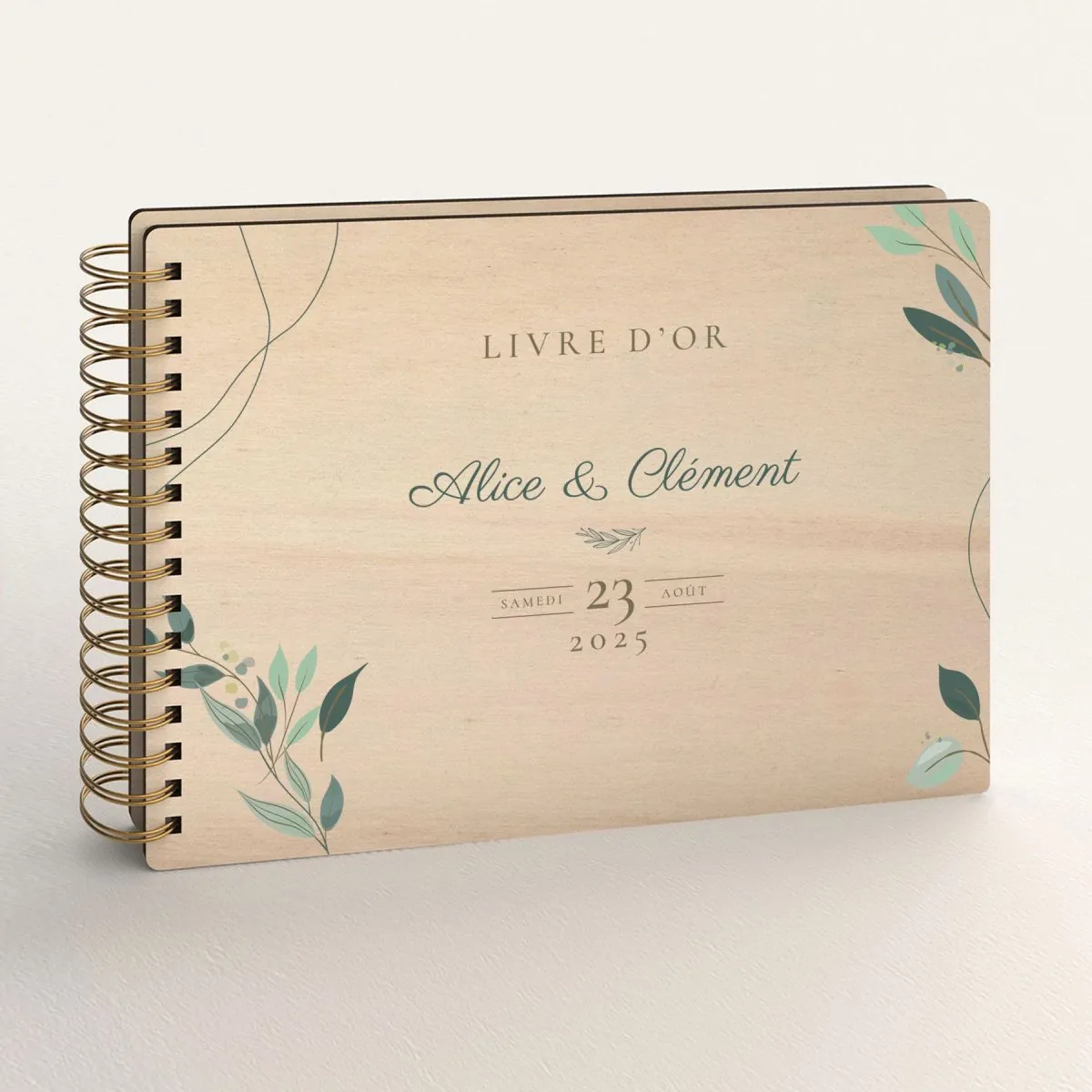 Nous vous proposons un livre d’or imprimé sur bois véritable. « Natural » : l’esprit d’un faire-part que nous avons voulu plein de fraicheur avec sa végétation aux verts tendres et ses courbes, parsemé de notes de couleur or ancien pour un esprit chic et festif.