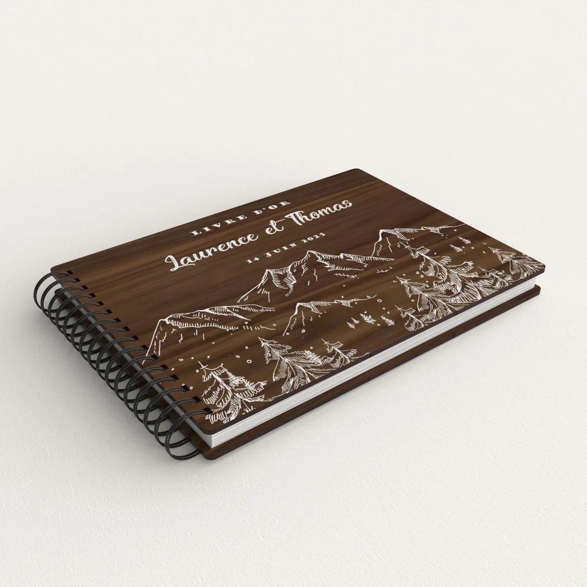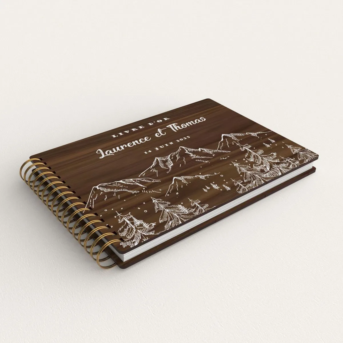 Livre d'or de mariage en bois personnalisé - En noyer - Sommets alpins
